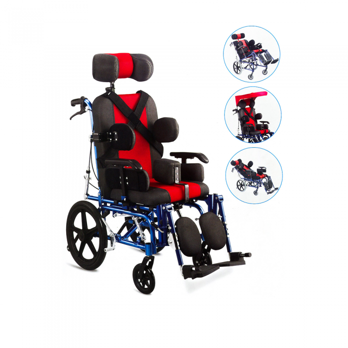 La silla de ruedas neurológica de aluminio está especialmente diseñada para aquellas personas que sufren de algún grado de parálisis cerebral y que necesitan mayor soporte y contención del tronco superior y cabeza. Cuenta con un respaldo alto, reclinable y con apoyo especial para la cabeza. Incluye un cinturón toráxico para mayor seguridad, protector lateral, apoya brazos y apoya pies ajustables y removibles. Los manillares de empuje son anatómicos y tienen frenos bilaterales. El respaldo se puede reclinar hasta 165°. Su estructura de aluminio plegable la hace muy liviana (solo 29 Kg) y fácil de transportar y almacenar.